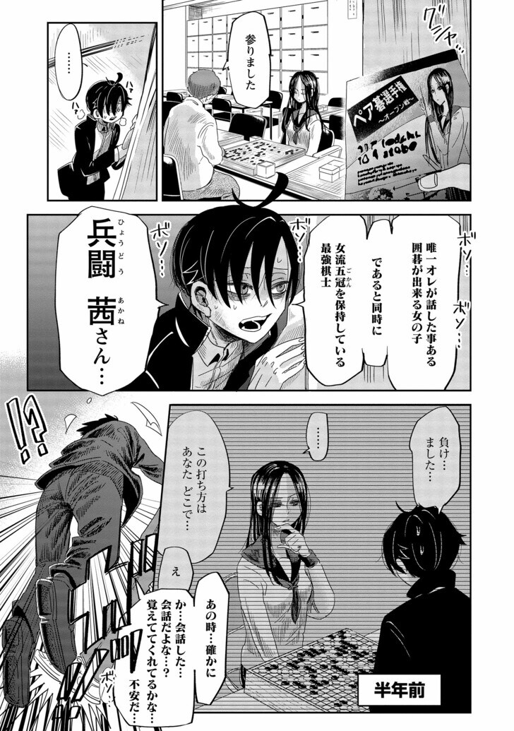 男女ペアの2人VS2人で行い、対局中は会話禁止の、知の格闘技「ペア碁」! 敵だけでなく、味方ペアの心中も読み合いながら戦う、実在のこの競技をテーマに、プロ棋士志望なのに、極度のあがり症で勝利をつかめない16歳の男子高校生・群舞(ぐんぶ)が、幼馴染で群舞へのストーカー愛が止まらない15歳・のぞみと共に成長してゆく超新感覚囲碁マンガ!