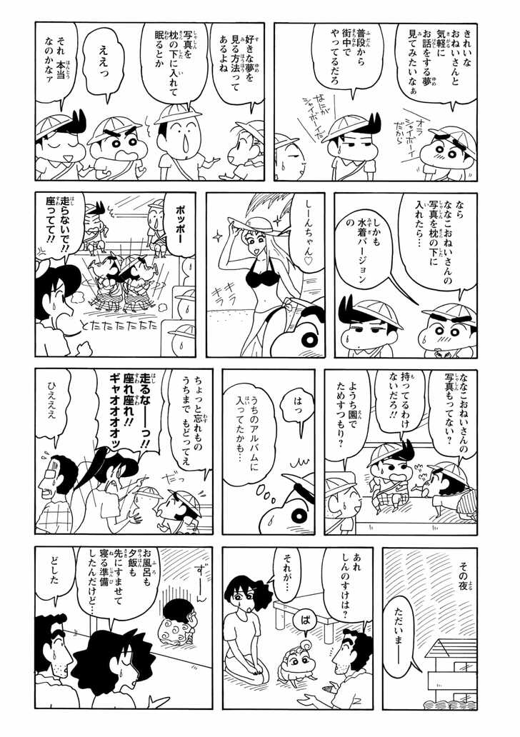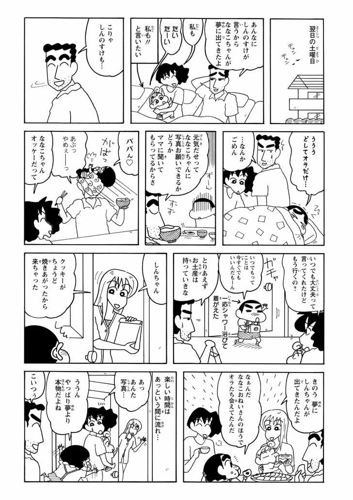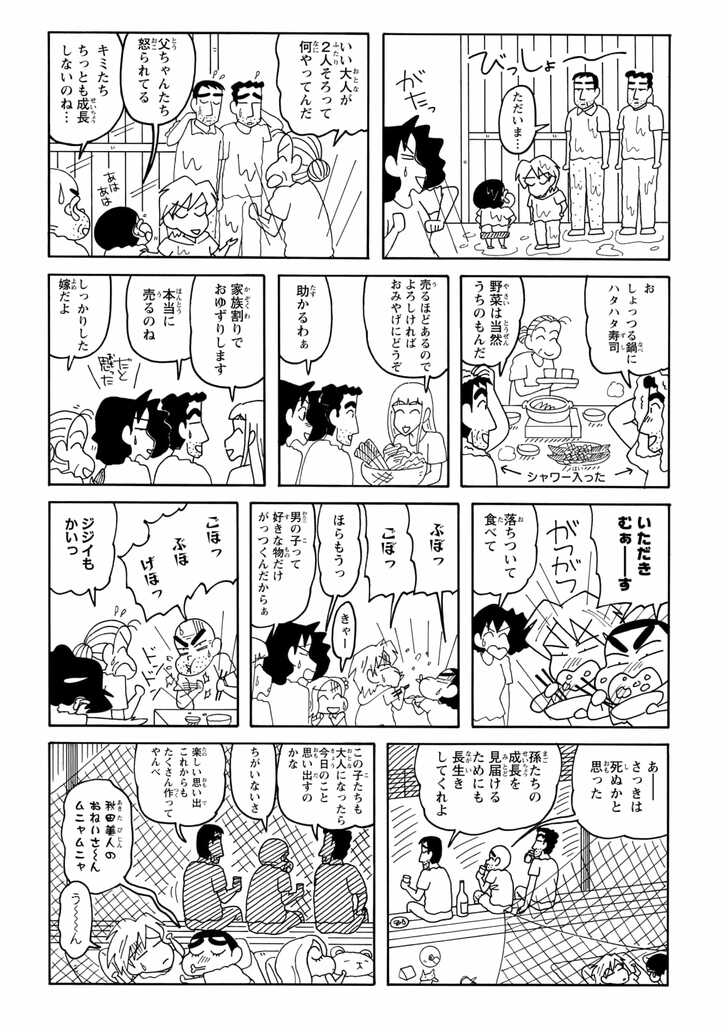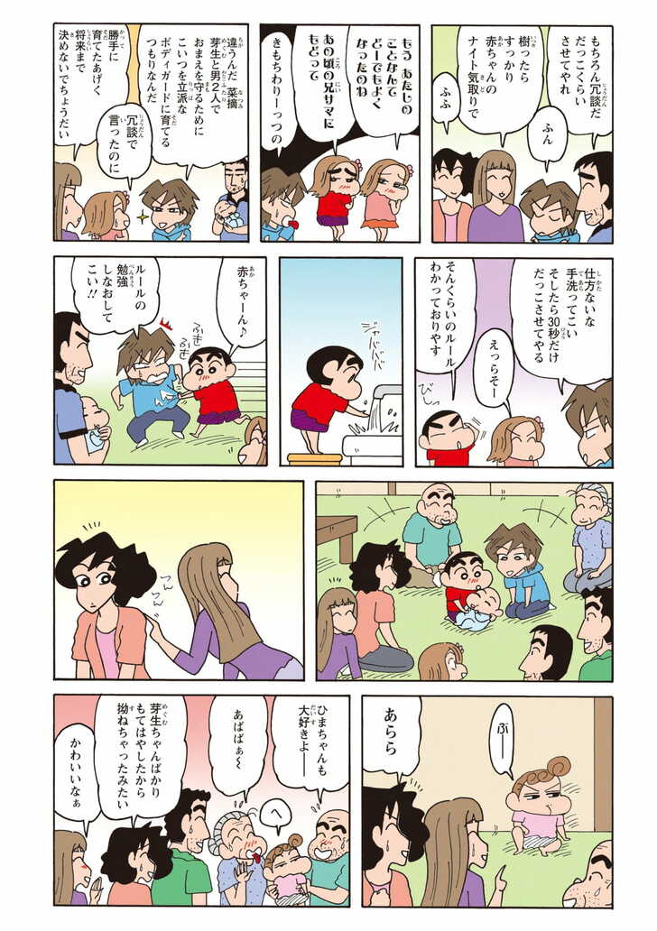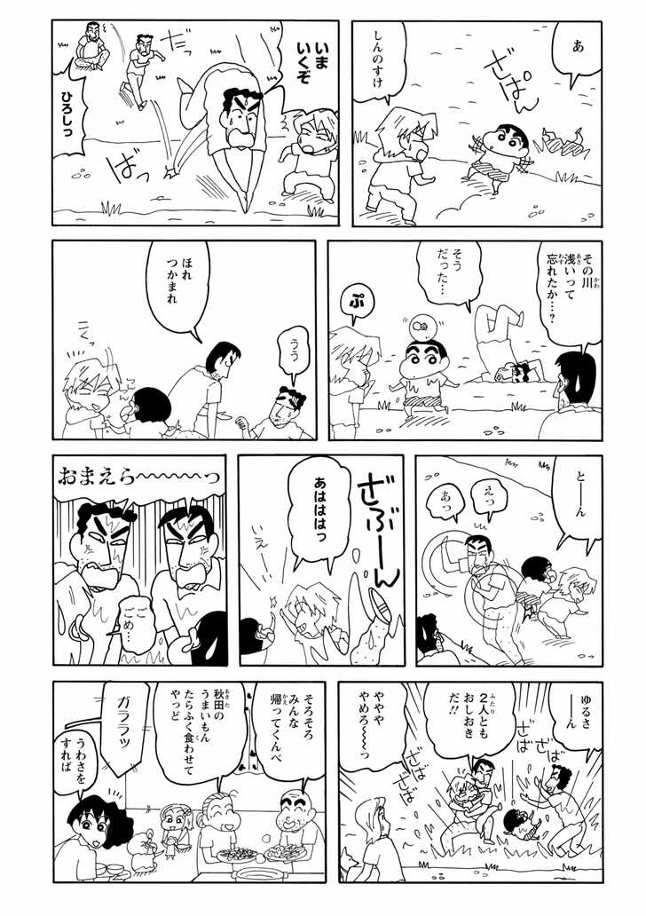 漫画 【無料漫画】しんのすけ、秋田の野原せましと、いとこに会いに行く!『新クレヨンしんちゃん』 #無料漫画 #4コマ漫画 #クレヨンしんちゃん 臼井儀人 2022.08.13 『新クレヨンしんちゃん』臼井儀人 2022年はアニメも30周年を迎える「クレヨンしんちゃん」。原作の「新クレヨンしんちゃん」12巻も充実の内容です。結婚して家族をもったひろしの兄・せまし。彼と銀の介がいる秋田に夏休みで遊びにいく野原一家。 しんのすけも、3人の従兄弟、樹、菜摘、芽生に会えて大ハシャギ! 忘れられない夏休みになったようです。外伝「ぶりぶりざえもんのぼうけん」の最新作も収録。見逃せない一冊となっております!! うすいよしと 臼井儀人 1987年に『だらくやストア物語』が「週刊漫画アクション」新人賞佳作に入賞しデビュー。90年8月より『クレヨンしんちゃん』を同誌にて連載開始。その他の代表作は『おーえるグミ』『あんBaらんすぞ~ん』『すくらんぶるえっぐ』など。 ポスト シェア LINEで送る