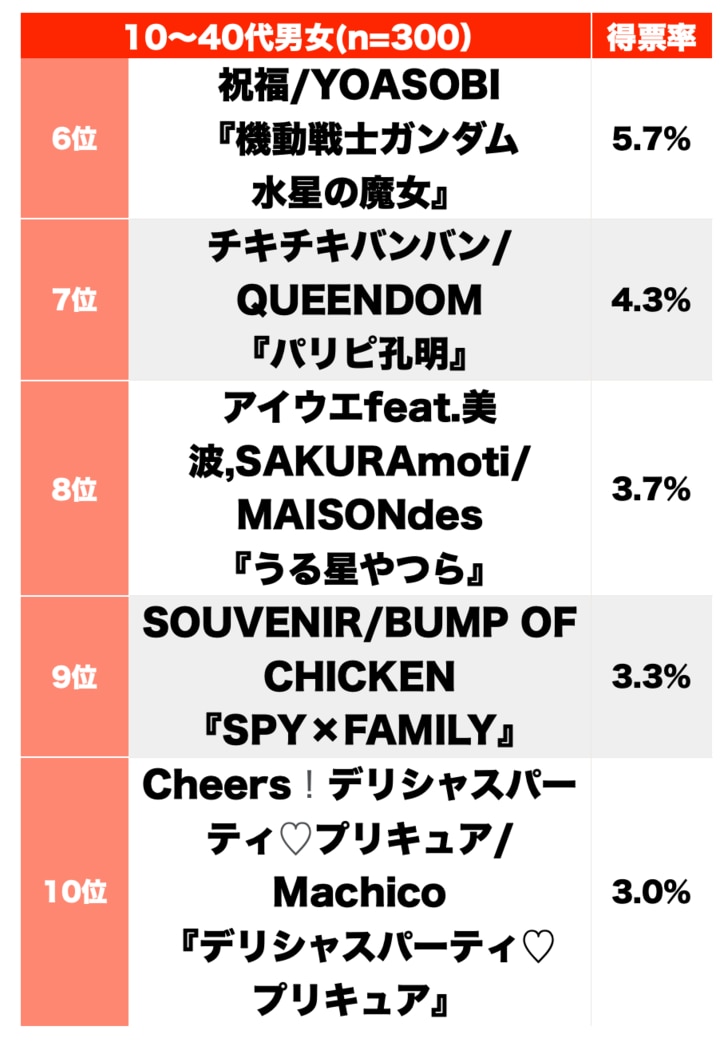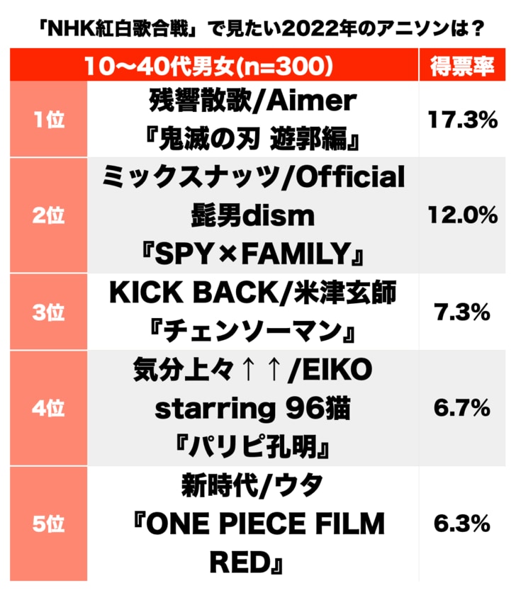 アニメ 『チェンソーマン』『SPY×FAMILY』今年のアニソンは名曲ばかり!「NHK紅白歌合戦」で聴いてみたい2022年のアニソンは?【ランキングBEST3】 (3/3ページ) 1ページ目から読む #チェンソーマン #鬼滅の刃 #SPYFAMILY #米津玄師 #ランキング ふたまん+編集部 2022.12.10 【画像】「紅白で見たい2022年のアニソン」1位から10位の結果 ※10代から40代の男女300名に「今年のNHK紅白歌合戦で見てみたいアニメソングは?」というアンケート調査を実施。(アンケートサイト「ボイスノート」協力) -画像の記事に戻る- 「紅白」で聴いてみたい2022年のアニソン4位以降の結果はコチラ! 1 2 3 ふたまんぷらすへんしゅうぶ ふたまん+編集部 「専門サイトが発信する本格的な記事にはついていけない」ライトユーザーに向けて、漫画・アニメ・ゲームなどを扱った「分かりやすく読みやすい」記事を毎日配信。編集部のモットーは「気軽に楽しく読める」! Twitter:@futamanplus facebook:@futamanplus 「NHK紅白歌合戦」で聴いてみたい2022年のアニソンランキング 『うる星』『パリピ孔明』『水星の魔女』もランクイン!「NHK紅白歌合戦」で聴いてみたい2022年アニソンは?【4位から10位】 ポスト シェア LINEで送る