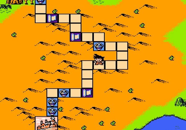 ファミコン1作目『ドラゴンボール 神龍の謎』は見下ろし型のアクションでしたが、2作目の『ドラゴンボール 大魔王復活』はすごろくとカードゲームを組み合わせたアドベンチャーRPG。「悟空伝」は、それを受け継ぎつつもブラッシュアップ。「大魔王復活」ではただのマスだったすごろくが、「悟空伝」ではバトルになるマスやアイテムがもらえるマスなどバラエティに富んでいます。ストーリーが進むごとに変化するすごろくマップには原作のエピソードが組み込まれており、ときにはキャラクターと会話しながら謎を解いたりしていきます。ある意味、原作漫画やアニメが一番の攻略本のゲームなのです。