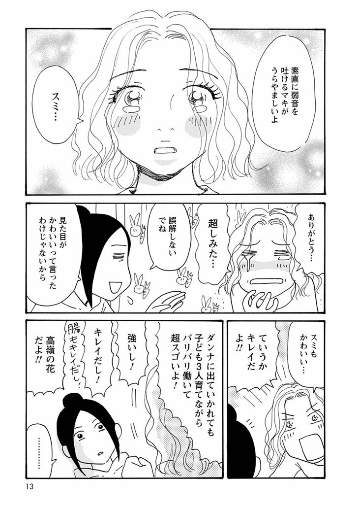 漫画 【無料漫画】『そもそもウチには芝生がない』第14話「アラフォー女子が“優しさ”で涙をこぼす時…」たちばなかおる (2/2ページ) 1ページ目から読む #無料漫画 #そもそもウチには芝生がない たちばなかおる 2024.11.19 ■『そもそもウチには芝生がない』過去回はこちらから読めます!■ 電子コミックス第1巻 電子コミックス最新刊13巻 ■無料で読める最新漫画はこちら 【漫画】食べれば人生が変わる「魔法メシ」…絶品からあげが「激ウマすぎる理由」とは 【漫画】あの頃の風景が今の自分を癒してくれる…心があったまる「昭和ドラマ」 【漫画】ママ友たちの壮絶「マウント合戦」…PTA活動の場はまさに「戦場」だった!? 【漫画】死ぬまで妻一筋のはずが…中年男が壊れた「年下同僚との一夜」 【漫画】リーマンもホストもハマる…「午前中しか味わえない」至福のおとこメシ 続きはこちら! 1 2 たちばなかおる たちばなかおる 12月14日生まれのA型、東京都出身。 主な著作『九後45は一周回って追いかける』『長男・次男・三男・夫よ 早く大人になってくれ!!(震え声)』『ユンタのゆっくり成長記』など。 無料漫画『そもそもウチには芝生がない』 【無料漫画】『そもそもウチには芝生がない』“住む世界が違いすぎる”アラフォー女性がPTAで痛感したギャップとは? 【無料漫画】『そもそもウチには芝生がない』第1話「3児の育児と仕事に追われる毎日…旦那はどこよ!?」たちばなかおる 【無料漫画】『そもそもウチには芝生がない』第2話「アラフォー女性が“イタさ”に気づく瞬間…?」たちばなかおる 【無料漫画】『そもそもウチには芝生がない』第3話「同居姑の“エグイひと言”に感情が大爆発…!?」たちばなかおる 【無料漫画】『そもそもウチには芝生がない』第4話「年下男子との出会いは恋の予感!?」たちばなかおる 【無料漫画】『そもそもウチには芝生がない』第5話「40代から“いい女”ってなれますか…!?」たちばなかおる 【無料漫画】『そもそもウチには芝生がない』第6話「“不完全な関係”が夫婦円満のヒケツ…!?」たちばなかおる 【無料漫画】『そもそもウチには芝生がない』第7話「年下男の“愛情表現”に10年ぶりの胸キュン!?」たちばなかおる 【無料漫画】『そもそもウチには芝生がない』第8話「ダンナの“浮気段階”を見抜く方法とは…?」たちばなかおる 【無料漫画】『そもそもウチには芝生がない』第9話「念願プロポーズは“親同居付き”…さぁどうする!? 」たちばなかおる 【無料漫画】『そもそもウチには芝生がない』第10話「アラフォーでも“妊娠”で喜んでいいですか…!?」たちばなかおる 【無料漫画】『そもそもウチには芝生がない』第11話「男女がルームメイトって“アリ”ですか…!?」たちばなかおる 【無料漫画】『そもそもウチには芝生がない』第12話「年下男の靴下にイライラしちゃう理由とは…!?」たちばなかおる 【無料漫画】『そもそもウチには芝生がない』第13話「アラフォー女子が転機で下した“大決断”」たちばなかおる 【無料漫画】『そもそもウチには芝生がない』第15話「恐怖!?“マウンティング女子”の実態とは…」たちばなかおる 【無料漫画】『そもそもウチには芝生がない』第16話「やさしいママがいきなり情緒不安定に…!?」たちばなかおる 【無料漫画】『そもそもウチには芝生がない』第17話「同世代の友達が“若返って見える”瞬間って…?」たちばなかおる 【無料漫画】『そもそもウチには芝生がない』第18話「人生で味わえる一番の痛み」たちばなかおる 【無料漫画】『そもそもウチには芝生がない』第19話「思ってたより痛い!? 40代出産のリアル…」たちばなかおる 【無料漫画】『そもそもウチには芝生がない』第20話「出産直後にイラッとくる“夫の地雷発言”」たちばなかおる 【無料漫画】『そもそもウチには芝生がない』第21話「新米ママが怯える…“子育てのピーク”っていつよ!」たちばなかおる 【無料漫画】『そもそもウチには芝生がない』第22話「既読スルーに“他の女の影”を感じる瞬間って…!?」たちばなかおる 【無料漫画】『そもそもウチには芝生がない』第23話「40女の大失恋…号泣以外の傷心ケアって?」たちばなかおる 【無料漫画】『そもそもウチには芝生がない』第24話「ダンナは“人生で一番好きな人”じゃない…!?」たちばなかおる 【無料漫画】『そもそもウチには芝生がない』第25話「カレに“運命”を感じる瞬間って…?」たちばなかおる 【無料漫画】『そもそもウチには芝生がない』第26話「元カレからメールって、どう返すのが正解なの…!?」たちばなかおる 【無料漫画】『そもそもウチには芝生がない』第27話「思い出の元カレから突然のお誘い…どうする!?」たちばなかおる 【無料漫画】『そもそもウチには芝生がない』第28話「若い頃の元カレが超イケオジ化してたら…?」たちばなかおる 【無料漫画】『そもそもウチには芝生がない』第29話「元彼の衝撃告白に…涙腺崩壊!」たちばなかおる 【無料漫画】『