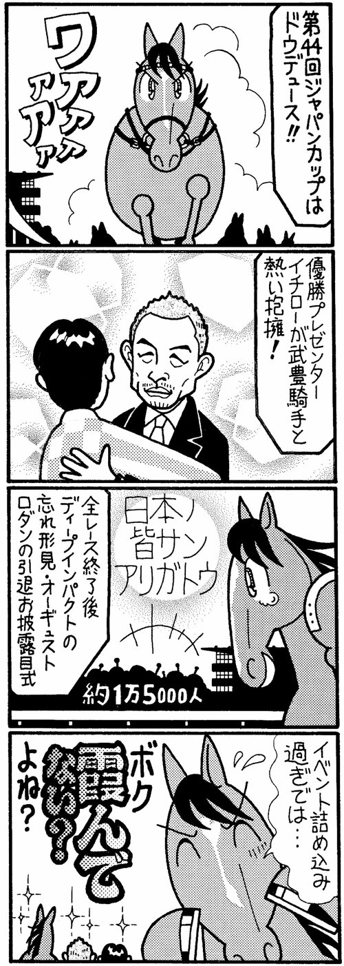 漫画 【無料漫画】競馬4コマ『馬なりde SHOW』第44回ジャパンカップ、私の存在霞んでない? #よしだみほ #漫画(マンガ) #4コマ漫画 #無料漫画 よしだみほ 2025.01.27 よしだみほ よしだみほ 『週刊大衆』連載中「馬なり de SHOW」と、netkeiba.com連載中「馬なり1ハロン!NEO」からの特選回、さらに描き下ろし4ページマンガ「VIP Party 2020」を収録した記念冊子【馬なりミニハロン劇場】を双葉社ECサイト上で発売中!歴史的な出来事が多かった2020年競馬界を、この1冊で振り返りましょう! よしだみほ よしだみほ 馬と舞台演劇を愛する競馬マンガ家。 趣味は観劇(俳優:鹿賀丈史・滝田栄推し)&キャラ惚れベースの日本史研究。 好物はお寿司とデコポン。 ポスト シェア LINEで送る