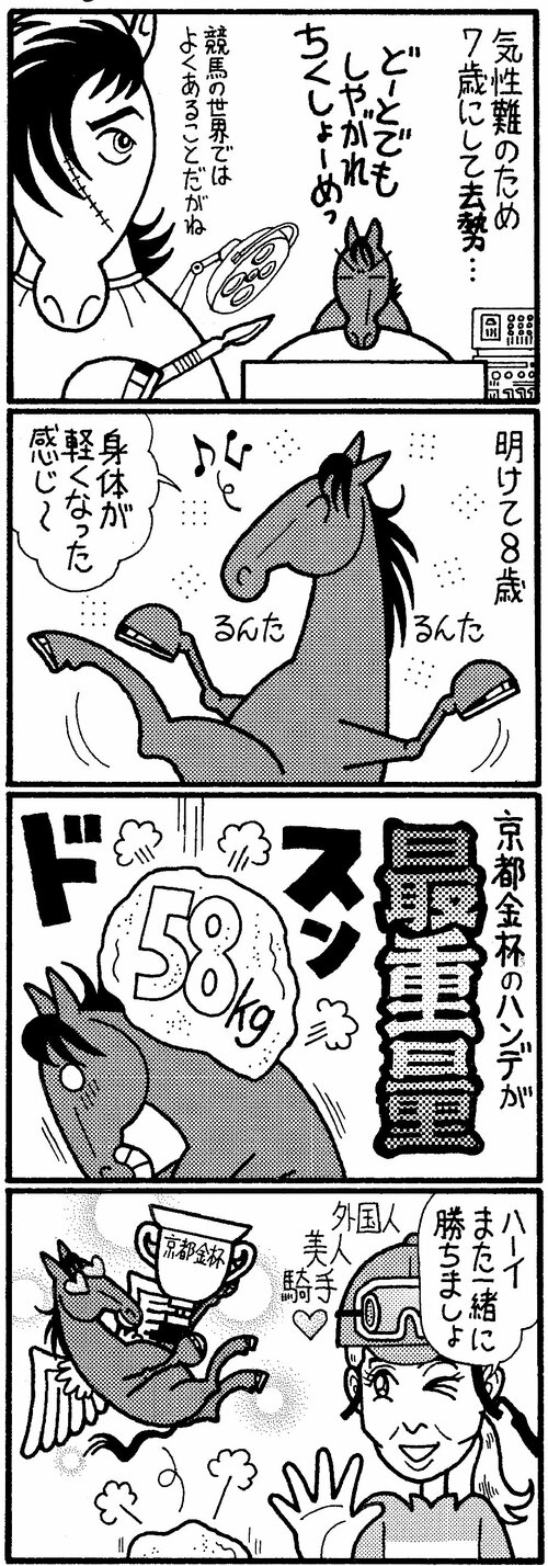 漫画 【無料漫画】競馬4コマ『馬なりde SHOW』体が軽くなったのに #よしだみほ #漫画(マンガ) #4コマ漫画 #無料漫画 よしだみほ 2025.02.24 よしだみほ よしだみほ 『週刊大衆』連載中「馬なり de SHOW」と、netkeiba.com連載中「馬なり1ハロン!NEO」からの特選回、さらに描き下ろし4ページマンガ「VIP Party 2020」を収録した記念冊子【馬なりミニハロン劇場】を双葉社ECサイト上で発売中!歴史的な出来事が多かった2020年競馬界を、この1冊で振り返りましょう! よしだみほ よしだみほ 馬と舞台演劇を愛する競馬マンガ家。 趣味は観劇(俳優:鹿賀丈史・滝田栄推し)&キャラ惚れベースの日本史研究。 好物はお寿司とデコポン。 ポスト シェア LINEで送る