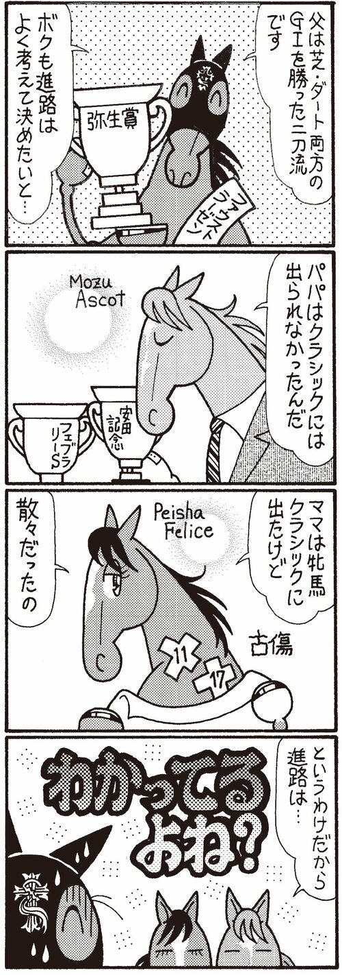 漫画 【無料漫画】競馬4コマ『馬なりde SHOW』進む道は一つ #よしだみほ #漫画(マンガ) #4コマ漫画 #無料漫画 よしだみほ 2025.04.07 よしだみほ よしだみほ 『週刊大衆』連載中「馬なり de SHOW」と、netkeiba.com連載中「馬なり1ハロン!NEO」からの特選回、さらに描き下ろし4ページマンガ「VIP Party 2020」を収録した記念冊子【馬なりミニハロン劇場】を双葉社ECサイト上で発売中!歴史的な出来事が多かった2020年競馬界を、この1冊で振り返りましょう! よしだみほ よしだみほ 馬と舞台演劇を愛する競馬マンガ家。 趣味は観劇(俳優:鹿賀丈史・滝田栄推し)&キャラ惚れベースの日本史研究。 好物はお寿司とデコポン。 ポスト シェア LINEで送る