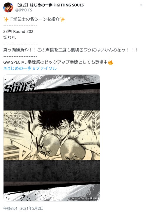 漫画 『はじめの一歩』最強のハードパンチャー・千堂武士と最強のカウンター使い・宮田一郎、戦ったら強いのはどっち? (3/3ページ) 1ページ目から読む #森川ジョージ #はじめの一歩 スパロウ 2025.05.14 ■【画像】「いい勝負しそう…」『はじめの一歩』千堂と宮田の名シーン ※画像は2021年に投稿された【公式】はじめの一歩 FIGHTING SOULS「@IPPO_FS」のポストより ※画像は2021年に投稿された【公式】はじめの一歩 FIGHTING SOULS「@IPPO_FS」のポストより -画像の記事に戻る- 1 2 3 すぱろう スパロウ アニメ・漫画系の記事を多数執筆する30代Webライター。アニメ・映画・芸能・サブカル系が得意ジャンル。 ポスト シェア LINEで送る