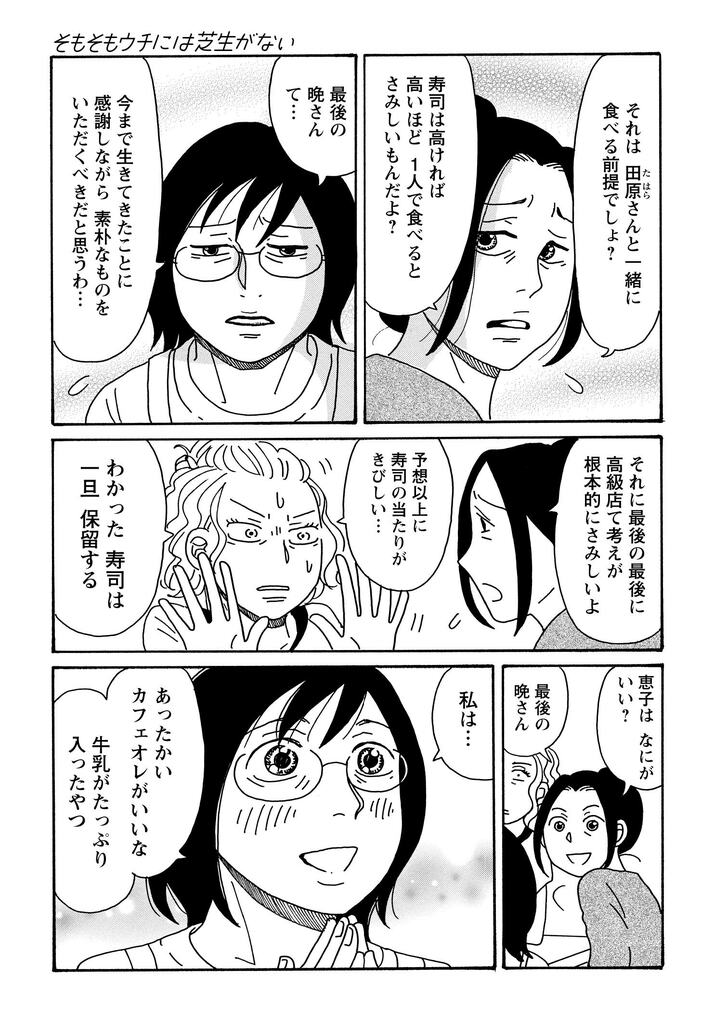 【無料漫画】『そもそもウチには芝生がない』第75話「人生最後の瞬間、何を口にしたい?」たちばなかおるの画像