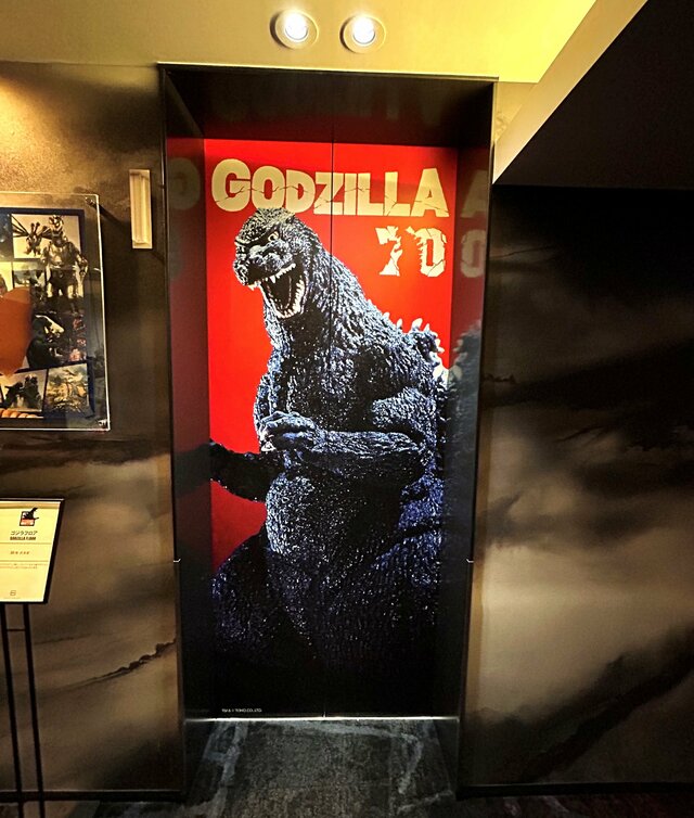 つづいてエレベーターで30階に上がると、いよいよそこは完全なる“ゴジラワールド”。フロア全体が「ゴジラフロア」となっており、3基のエレベーターの扉にはそれぞれ異なるゴジラアートが描かれている。さらに、廊下には歴代『ゴジラ』映画の名場面が並ぶギャラリーが展開されており、過去作の記憶が鮮やかに蘇る。この日は、懐かしの名シーンに思いを馳せながら、ひとつひとつじっくり見ていきたくなる気持ちを抑え先に進んだ。