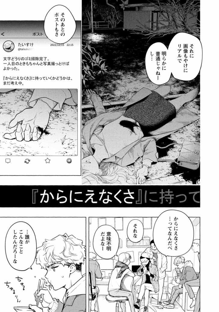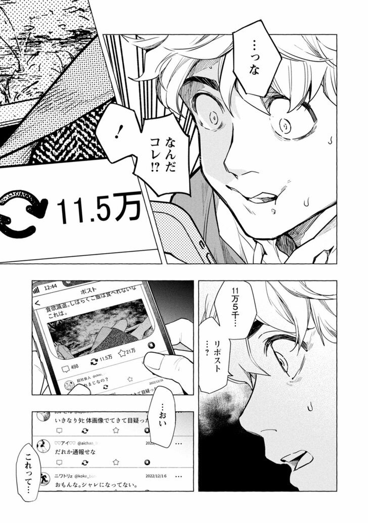 漫画 【無料漫画】『俺ではない炎上』自分のフリをした誰かが犯行現場を投稿した結果… (3/5ページ) 1ページ目から読む #無料漫画 浅倉秋成 桜鳥556 2025.09.25 次ページ:犯人はまさかの人物? 1 2 3 4 5 ポスト シェア LINEで送る