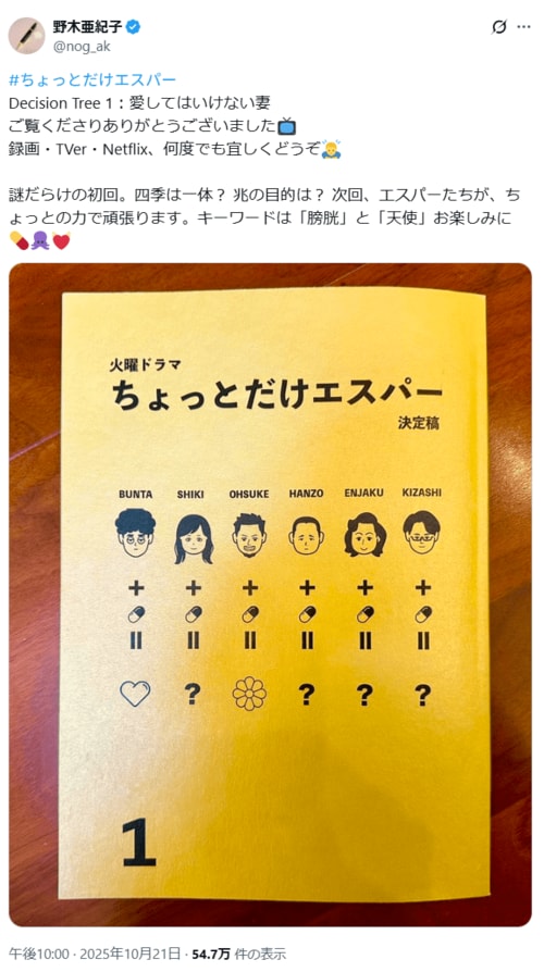 その他 謎だらけのドラマ『ちょっとだけエスパー』、宮﨑あおい「ミステリアス妻」を読み解く「脚本家の重大ヒント」 (2/2ページ) 1ページ目から読む #大泉洋 すがり 2025.10.28 ■【画像】「まさか四季ちゃんが…!?」『ちょっとだけエスパー』脚本家・野木亜紀子による“重大ヒント” ※画像は2025年に投稿された野木亜紀子「@nog_ak」のポストより -画像の記事に戻る- 1 2 すがり すがり 生まれも育ちも愛知県。物心ついたときからとにかく読書が好きで、小説に漫画、エッセイなど、気になるものならなんでも読む。本を読む時間を最優先したいがためにフリーライターになった。 ポスト シェア LINEで送る