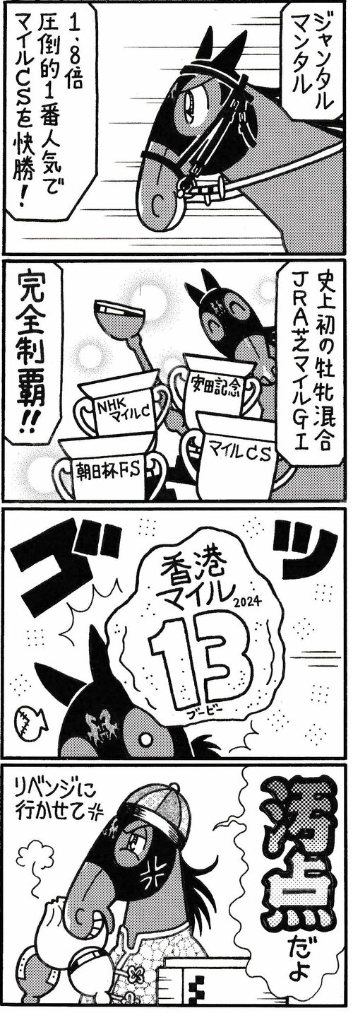 漫画 【無料漫画】競馬4コマ『馬なりde SHOW』国内敵なし #よしだみほ #漫画(マンガ) #4コマ漫画 #無料漫画 よしだみほ 2025.11.28 よしだみほ よしだみほ 2019年に連載1000R&最終回を迎えた『馬なり1ハロン劇場』電子版が絶賛発売中。 netkeiba.com連載中の「馬なり1ハロン!NEO」もお楽しみください。 よしだみほ よしだみほ 馬と舞台演劇を愛する競馬マンガ家。 趣味は観劇(俳優:鹿賀丈史・滝田栄推し)&キャラ惚れベースの日本史研究。 好物はお寿司とデコポン。 ポスト シェア LINEで送る