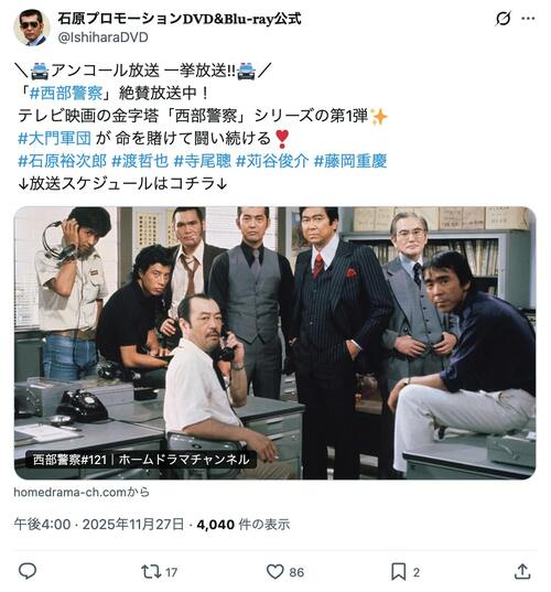 その他 昭和ドラマの金字塔! 伝説の刑事ドラマ『西部警察』爆死に銃殺…視聴者が驚愕した「あまりに壮絶な殉職シーン」 (3/3ページ) 1ページ目から読む #渡哲也 #舘ひろし でかいペンギン 2025.12.02 ■【画像】「男の色気が凄い!」『西部警察』撮影当時の渡哲也さん、舘ひろしさん、石原裕次郎さんの姿 ※石原プロモーション𝐃𝐕𝐃&𝐁𝐥𝐮-𝐫𝐚𝐲公式X(@IshiharaDVD)のポストより -画像の記事に戻る- 1 2 3 でかいぺんぎん でかいペンギン 幼いころの夢は漫画家。少年ジャンプによって育てられ、今でも夜中まで漫画を読み、母親になった現在は成人した子供から早く寝ろと叱られている。好きな漫画家は岡田あーみん。 ポスト シェア LINEで送る