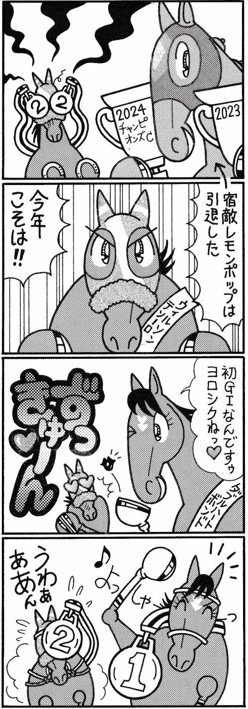 漫画 【無料漫画】競馬4コマ『馬なりde SHOW』新たな宿敵 #よしだみほ #漫画(マンガ) #4コマ漫画 #無料漫画 よしだみほ 2025.12.12 よしだみほ よしだみほ 2019年に連載1000R&最終回を迎えた『馬なり1ハロン劇場』電子版が絶賛発売中。 netkeiba.com連載中の「馬なり1ハロン!NEO」もお楽しみください。 よしだみほ よしだみほ 馬と舞台演劇を愛する競馬マンガ家。 趣味は観劇(俳優:鹿賀丈史・滝田栄推し)&キャラ惚れベースの日本史研究。 好物はお寿司とデコポン。 ポスト シェア LINEで送る