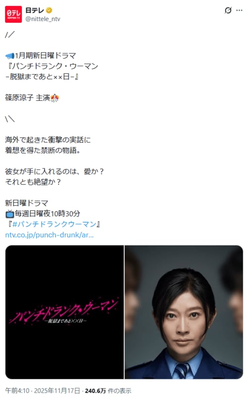 その他 実は「エンタメ」の人気要素が凝縮…!? 篠原涼子主演ドラマ『パンチドランク・ウーマン』に期待が高まるワケ (2/2ページ) 1ページ目から読む #篠原涼子 #ジェシー #藤木直人 蒼影コウ 2026.01.10 ■【画像】全然イメージ違う…篠原涼子さんが挑む「新境地」に期待の声 ※画像は2025年に投稿された日テレ「@nittele_ntv」のポストより -画像の記事に戻る- 1 2 あおかげ・こう 蒼影コウ 雑誌&ウェブライター/編集者、大手出版社で男性週刊誌、月刊アイドル誌、グラビアアイドル誌、ウェブメディアの編集長を経てフリー。現在はエンタメ・芸能サイトを中心にドラマ、映画、アニメ記事を執筆中。漫画オタクで月に26誌チェックする時間を作るのに悪戦苦闘中。我が心の一冊は『めぞん一刻』。 ポスト シェア LINEで送る