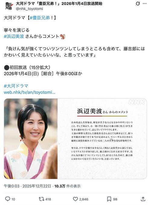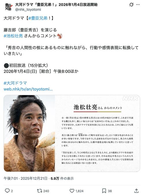 漫画 2026年大河『豊臣兄弟!』ではどう描かれる? 『花の慶次』に『センゴク』『信長を殺した男』個性豊かな「マンガ作品の豊臣秀吉像」 (4/4ページ) 1ページ目から読む #大河ドラマ #豊臣秀吉 #花の慶次 #原哲夫 ジャッキー 2025.12.27 ■【画像】「イメージぴったり!」 2026年大河ドラマ『豊臣兄弟!』秀吉役・池松壮亮さん、寧々役・浜辺美波さん ※大河ドラマ「豊臣兄弟!」公式X(@nhk_toyotomi)のポストより ※大河ドラマ「豊臣兄弟!」公式X(@nhk_toyotomi)のポストより -画像の記事に戻る- 1 2 3 4 じゃっきー ジャッキー 80~90年代の漫画やゲームに映画をこよなく愛する40代半ばの中年マン。令和になっても漫画を読み続けている3児の父で子どもの方が大人っぽい。 ポスト シェア LINEで送る