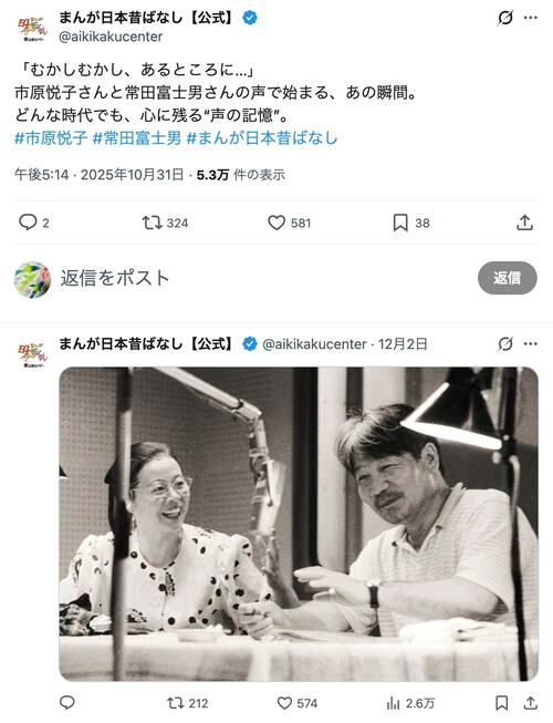 アニメ 『耳なし芳一』に『十六人谷』『牛鬼淵』も…『まんが日本昔ばなし』忘れられない「恐怖のエピソード」 (3/3ページ) 1ページ目から読む #まんが日本昔ばなし もくもく 2026.01.07 ■【画像】「むかしむかしあるところに…」レアすぎる!『まんが日本昔ばなし』市原悦子さんと常田富士男さんの収録現場 ※まんが日本昔ばなし【公式】X(@aikikakucenter)のポストより -画像の記事に戻る- 1 2 3 もくもく もくもく 子育て中のママさんライター。愛読書は『りぼん』で育ち、『犬夜叉』にどハマりしてからアニメも見るように。少女漫画からグロ系漫画まで手広く好む。 ポスト シェア LINEで送る