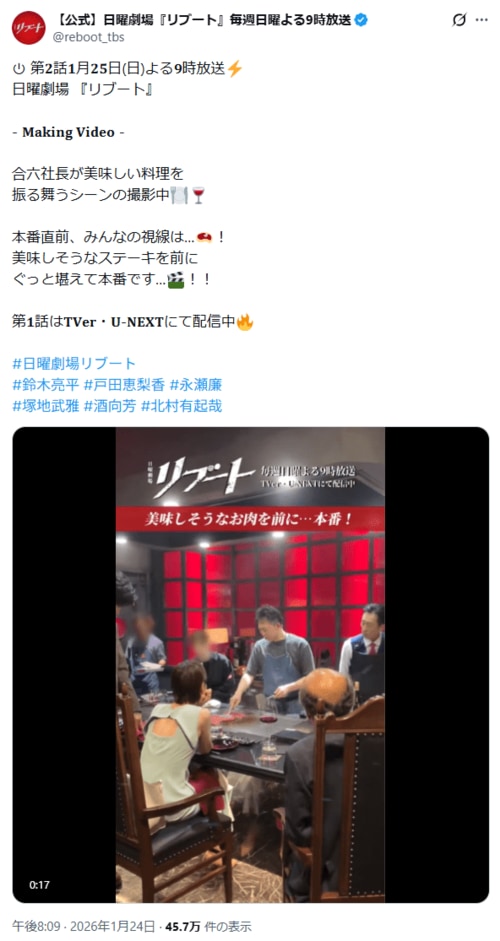その他 鈴木亮平主演ドラマ『リブート』事件のカギを握る「リブート前の儀堂」現段階で判明した素性 (2/2ページ) 1ページ目から読む #鈴木亮平 #松山ケンイチ #戸田恵梨香 すがり 2026.02.01 ■【画像】大胆衣装で背中見せ…後ろ姿も美しい戸田恵梨香さん ※画像は2026年に投稿された【公式】日曜劇場『リブート』毎週日曜よる9時放送「@reboot_tbs」のポストより -画像の記事に戻る- 1 2 すがり すがり 生まれも育ちも愛知県。物心ついたときからとにかく読書が好きで、小説に漫画、エッセイなど、気になるものならなんでも読む。本を読む時間を最優先したいがためにフリーライターになった。 ポスト シェア LINEで送る