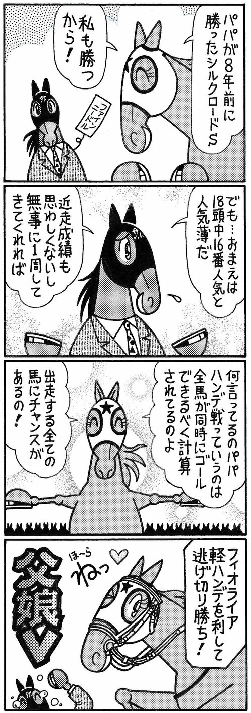 漫画 【無料漫画】競馬4コマ『馬なりde SHOW』斤量 #よしだみほ #漫画(マンガ) #4コマ漫画 #無料漫画 よしだみほ 2026.02.06 よしだみほ よしだみほ 2019年に連載1000R&最終回を迎えた『馬なり1ハロン劇場』電子版が絶賛発売中。 netkeiba.com連載中の「馬なり1ハロン!NEO」もお楽しみください。 よしだみほ よしだみほ 馬と舞台演劇を愛する競馬マンガ家。 趣味は観劇(俳優:鹿賀丈史・滝田栄推し)&キャラ惚れベースの日本史研究。 好物はお寿司とデコポン。 ポスト シェア LINEで送る