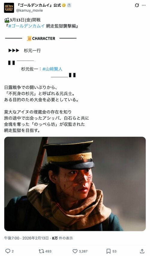 漫画 【ゴールデンカムイ「実写化の圧巻再現」1】山﨑賢人が肉体改造で再現した「不死身の杉元」のリアル 10kg増量で作り上げた猛々しさ (2/2ページ) 1ページ目から読む #野田サトル #ゴールデンカムイ #実写化 #山﨑賢人 創也慎介 2026.03.11 ■【画像】「10kg増の肉体改造も…」頬の傷跡、鋭い眼光も驚愕再現『ゴールデンカムイ』杉元佐一役の山﨑賢人さん ※『ゴールデンカムイ』公式X(@kamuy_movie)のポストより ■Blu-rayをAmazonで購入 『ゴールデンカムイ』ブルーレイ&DVDセット(初回限定版) [Blu-ray] -画像の記事に戻る- 1 2 つくりやしんすけ 創也慎介 岡山県出身。現在は千葉で1児の父として奮闘するかたわら、作家、物書きを目指して進む毎日。幼少期から現在まで『ジョジョの奇妙な冒険』を愛読。アクション、バトル、ホラーなどのサブカルを好む。 Twitter:@tsukuriya0000 ポスト シェア LINEで送る