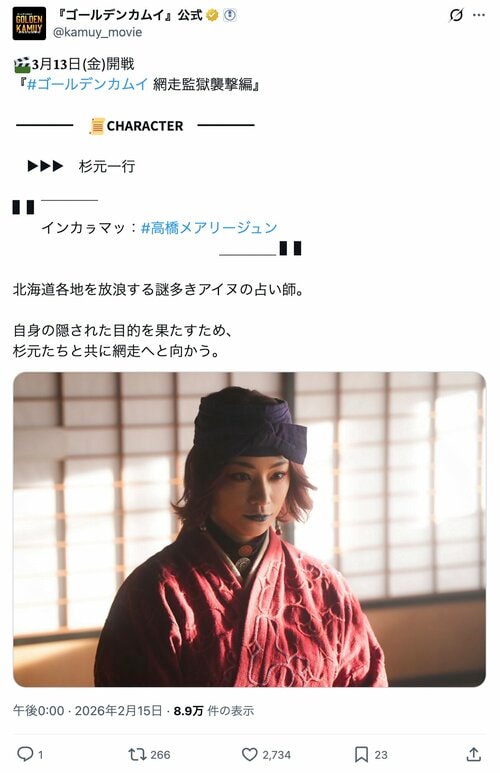 【ゴールデンカムイ「実写化の圧巻再現」5】高橋メアリージュンが魅せた「妖艶美女」 ファンも絶賛した「次元超え」の再現度 (2/2ページ) 1ページ目から読む #野田サトル #ゴールデンカムイ #高橋メアリージュン 創也慎介 2026.03.15 ■【画像】「妖艶さがすごい…」驚愕の圧巻再現『ゴールデンカムイ』インカラマッ役の高橋メアリージュンさん ※『ゴールデンカムイ』公式X(@kamuy_movie)のポストより ■Blu-rayをAmazonで購入 『ゴールデンカムイ』ブルーレイ&DVDセット(初回限定版) [Blu-ray] -画像の記事に戻る- 1 2 つくりやしんすけ 創也慎介 岡山県出身。現在は千葉で1児の父として奮闘するかたわら、作家、物書きを目指して進む毎日。幼少期から現在まで『ジョジョの奇妙な冒険』を愛読。アクション、バトル、ホラーなどのサブカルを好む。 Twitter:@tsukuriya0000 ゴールデンカムイ「実写化の圧巻再現」 【ゴールデンカムイ「実写化の圧巻再現」1】山﨑賢人が肉体改造で再現した「不死身の杉元」のリアル 10kg増量で作り上げた猛々しさ 【ゴールデンカムイ「実写化の圧巻再現」2】『ゴールデンカムイ』玉木宏が完璧再現した「不気味ビジュアル」 醸し出す「異様な恐怖」で観客を圧倒… 【ゴールデンカムイ「実写化の圧巻再現」3】山田杏奈が完璧再現した「頼もしき美少女」 圧巻の透明感で「どう見ても10代前半…」 【ゴールデンカムイ「実写化の圧巻再現」4】池内博之が魅せた「圧巻キャラ再現」 筋骨隆々の肉体にミステリアスな色香も… ポスト シェア LINEで送る