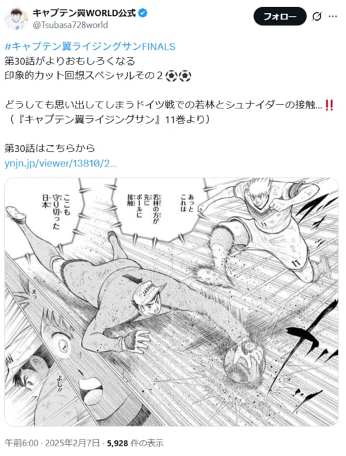 漫画 『キャプテン翼』SGGK若林源三「まさかの失点シーン」なんと石崎にもゴールを許していた!? (3/3ページ) 1ページ目から読む #高橋陽一 #キャプテン翼 蒼影コウ 2026.03.24 ■【画像】「えっ、そんな…」『キャプテン翼』若林まさかの“退場”が決まった瞬間 ※画像は2025年に投稿されたキャプテン翼WORLD公式「@Tsubasa728world」のポストより ■コミックスをAmazonで購入 『キャプテン翼 ライジングサン 11』 購入はこちらから -画像の記事に戻る- 1 2 3 あおかげ・こう 蒼影コウ 雑誌&ウェブライター/編集者、大手出版社で男性週刊誌、月刊アイドル誌、グラビアアイドル誌、ウェブメディアの編集長を経てフリー。現在はエンタメ・芸能サイトを中心にドラマ、映画、アニメ記事を執筆中。漫画オタクで月に26誌チェックする時間を作るのに悪戦苦闘中。我が心の一冊は『めぞん一刻』。 ポスト シェア LINEで送る