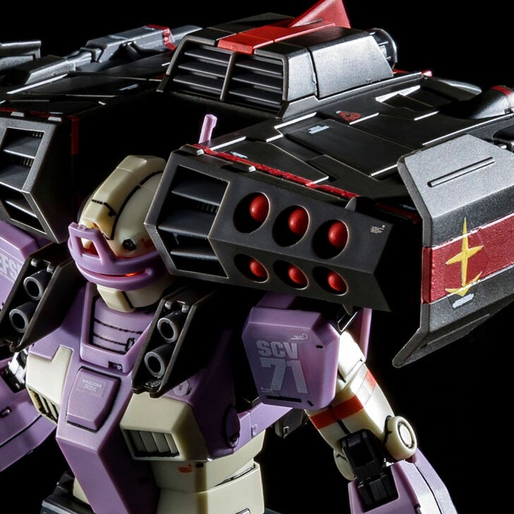 両肩に重厚なフェロウ・ブースターを装着した姿は、とてもジムとは思えないほどのボリューム感。メカメカしい大型ブースターを装備した時のフォルムとシルエットは、インパクトがある。