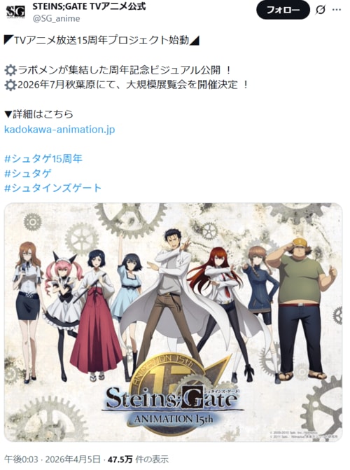 アニメ アニメ『シュタインズ・ゲート』放送開始15周年!記念ビジュアル公開&「大規模展覧会」開催決定 (2/2ページ) 1ページ目から読む #シュタインズゲート #アニメ ふたまん+編集部 2026.04.06 ■【画像】3年ぶりの投稿…!?「エモすぎる」と話題の描きおろしビジュアル ※画像は2026年に投稿されたSTEINS;GATE TVアニメ公式「@SG_anime」のポストより -画像の記事に戻る- 1 2 ふたまんぷらすへんしゅうぶ ふたまん+編集部 マンガ+アニメ+ゲームをたっぷりどっぷり!双葉社のポップカルチャー情報サイト。 「読んで楽しい、知ってうれしい」をキーワードに、ライトユーザーでもコアユーザーでも楽しめるコンテンツを毎日発信!! X:@futamanplus facebook:@futamanplus ポスト シェア LINEで送る