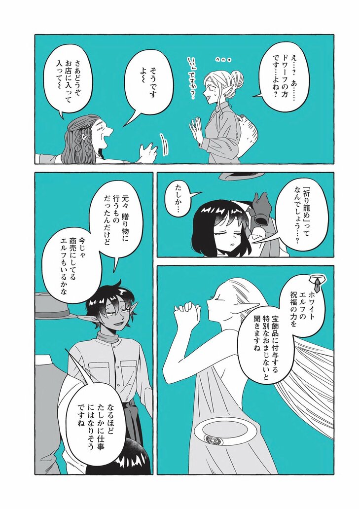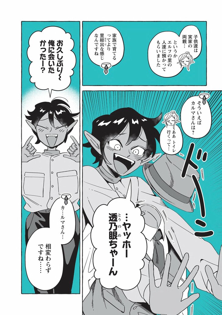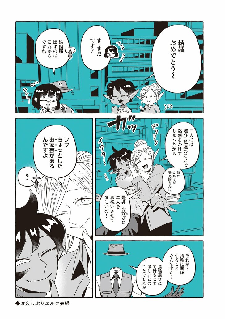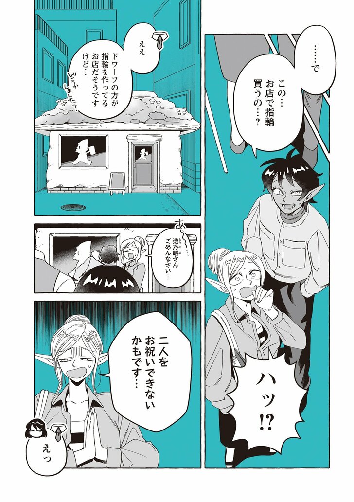 スマートで優しい探偵「透明男」透乃眼さんと、おっとりタイプで目の見えない「人間女性」夜香さんが同棲を始めて半年たった頃。婚姻届を出す前に結婚指輪を作ることになり、カルマとライトに付き添ってもらい向かった先は、ドワーフ職人のお店で……? さらには盗難事件が!?