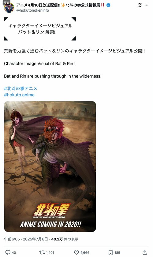 漫画 『北斗の拳』コソ泥少年・バットが“最高の漢”になるまでの軌跡を振り返る (3/3ページ) 1ページ目から読む #北斗の拳 #武論尊 #原哲夫 #週刊少年ジャンプ でかいペンギン 2026.04.17 ■【画像】「こんなに美少年だったっけ!?」2026年新作アニメ『北斗の拳』解禁された「バット」のビジュアル ※北斗の拳公式情報局X(@hokutonokeninfo)のポストより -画像の記事に戻る- 1 2 3 でかいぺんぎん でかいペンギン 幼いころの夢は漫画家。少年ジャンプによって育てられ、今でも夜中まで漫画を読み、母親になった現在は成人した子供から早く寝ろと叱られている。好きな漫画家は岡田あーみん。 ポスト シェア LINEで送る