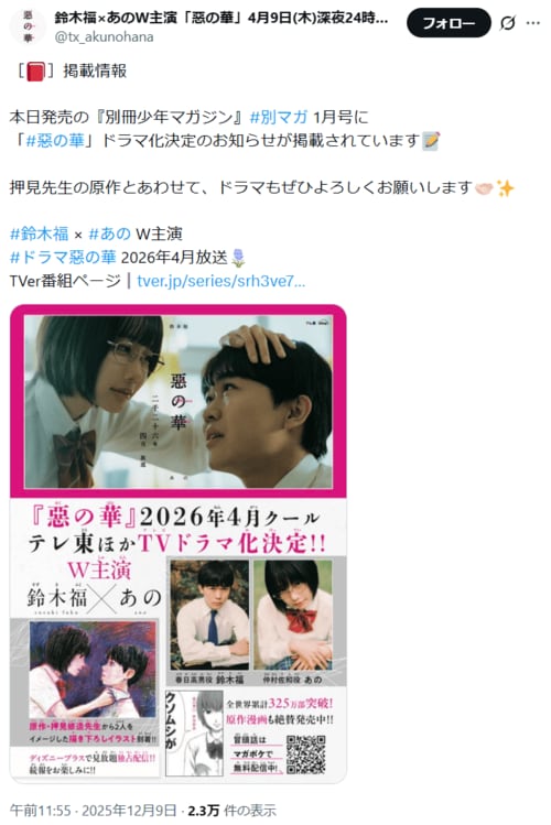ドラマ映画 2026春ドラマ「人気漫画が原作」の注目作チェック! 松重豊『孤独のグルメ』に、あのちゃん『惡の華』、原菜乃華『るなしい』も… (3/3ページ) 1ページ目から読む #孤独のグルメ さえきしの 2026.04.09 ■【画像】「再現度エグっ」“伝説的コミック”実写ドラマ化…衝撃シーンにも期待集まる ※画像は2025年に投稿された鈴木福×あのW主演「惡の華」4月9日(木)深夜24時放送スタート【テレ東公式】「@tx_akunohana」のポストより -画像の記事に戻る- 1 2 3 さえきしの さえきしの 漫画と映画をこよなく愛しジャンプとりぼんを読んで育った30代。バトルものからホラー、恋愛ものまで幅広く手を出す。好きな漫画は『SLAM DUNK』と『ザ・ファブル』。安野モヨコのイラストが大好き。 ポスト シェア LINEで送る