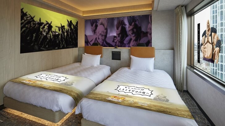 作中に登場する“ザコたち”が束の間の休息を求めた場というテーマでデザインされた特別仕様の客室で、壁面タペストリーやベッド回りの装飾には彼らの姿が大胆にレイアウト。客室の照明を落とすと、壁に「北斗七星」が浮かび上がる……という、往年のファンにとっては胸が踊る演出が用意されている。