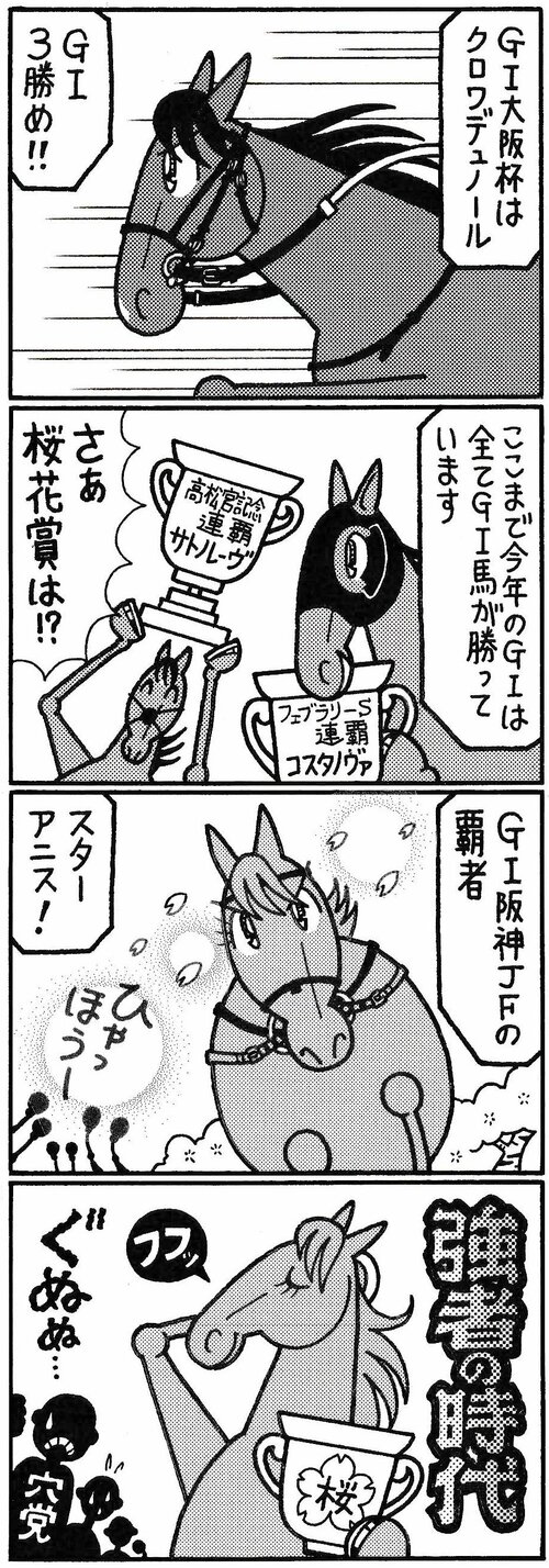 無料コミック 【無料漫画】競馬4コマ『馬なりde SHOW』GⅠ馬の強さ #よしだみほ #漫画(マンガ) #4コマ漫画 #無料漫画 よしだみほ 2026.04.17 よしだみほ よしだみほ 2019年に連載1000R&最終回を迎えた『馬なり1ハロン劇場』電子版が絶賛発売中。 netkeiba.com連載中の「馬なり1ハロン!NEO」もお楽しみください。 よしだみほ よしだみほ 馬と舞台演劇を愛する競馬マンガ家。 趣味は観劇(俳優:鹿賀丈史・滝田栄推し)&キャラ惚れベースの日本史研究。 好物はお寿司とデコポン。 ポスト シェア LINEで送る
