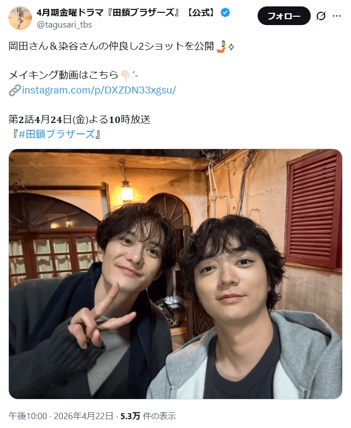 ドラマ映画 ドラマ『田鎖ブラザーズ』第1話で示された「重要情報」…兄弟の「背景」と田鎖家事件の「伏線描写」 (2/2ページ) 1ページ目から読む #岡田将生 #染谷将太 すがり 2026.04.24 ■【画像】「ギャップすごすぎ」萌え袖があざとい…『田鎖ブラザーズ』仲良しツーショット ※画像は2026年に投稿された4月期金曜ドラマ『田鎖ブラザーズ』【公式】「@tagusari_tbs」のポストより -画像の記事に戻る- 1 2 すがり すがり 生まれも育ちも愛知県。物心ついたときからとにかく読書が好きで、小説に漫画、エッセイなど、気になるものならなんでも読む。本を読む時間を最優先したいがためにフリーライターになった。 ポスト シェア LINEで送る