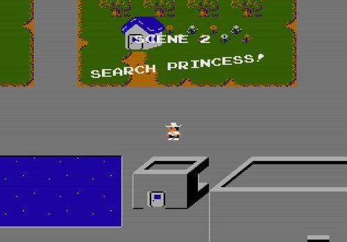 シーン2の開始時「王女をさがせ(SEARCH PRINCESS!)」の表記が出て、いきなり市街地に放り出されます。さっぱり目的が分からないので説明書を見ると、シーン2では王女様のいるピラミッドに入るのに必要な「3種類のキーワード」を集めるとのこと。ちなみにシーン2のステージは縦横10画面分、合計100画面分の広さがあって、洞くつの中にキーワードとなるアイテムが隠されているそうです。