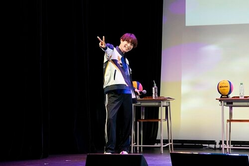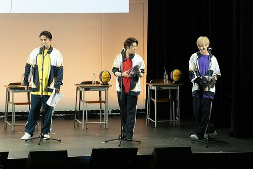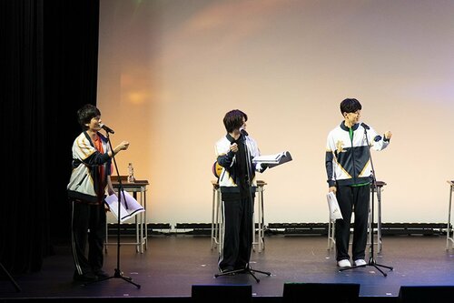 最後のコーナーは、いよいよお待ちかねの特別朗読劇。この日のために西田総監督が書き下ろした新作で、タイトルは『水着』。山南メンバーが練習に励んでいる最中、牛窓や網浜が水球向きの水着を着ていないことをみなとが指摘し、「せっかくなんで」と全員でお揃いの水着を買いに行くというエピソードだ。スポーツショップではそれぞれが選んだ水着をスクリーンで発表していくが、ここで映し出されるのはすべてキャスト陣による手描きイラスト。花柄や縞模様など、それぞれ“らしさ”があふれるデザインの中で、一同をザワつかせたのは網浜(斉藤)提案の水着。黒一色のシャープな線で描かれたそれはもはや紐…というデザインで、ツッコミのアドリブが止まらない。最終的には、指のゲーム「いっせーの」で決めることになり、江尻(古川)が2番手で早くも決着させるという強さを見せる。そんな展開で、今回の朗読劇は山南メンバーとキャスト陣の賑やかなやりとりがリンクする楽しいものとなった。